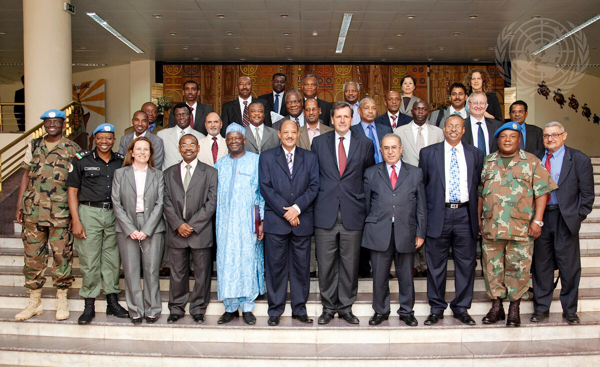 Alain Le Roy (front, fifth from right) poses for a group photo with participants of the eighth meeting of the African Union, United Nations, Government of the Sudan Tripartite Mechanism on the African Union-United Nations Hybrid Operation in Darfur (UNAMID), in Addis Ababa, Ethiopia. Among the participants: Ibrahim Gambari (fifth from left), Joint Special Representative for UNAMID; Magzoub Rahma Al Badawi (sixth from left), Director of International Cooperation at the Sudanese Ministry of Defense; Ramtane Lamamra (fourth from right), Commissioner for Peace and Security of the African Union; and Mohamed Yonis (third from right), Deputy Joint African Union-United Nations Special Representative for Operations and Management.