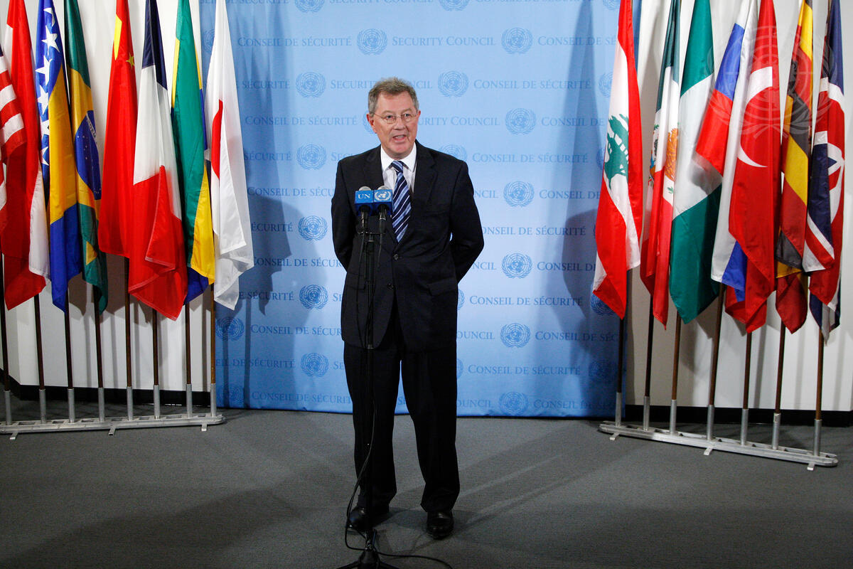 Robert Serry, UN Special Coordinator for the Middle East Peace Process, addresses members of the press following his briefing to the Security Council. Mr. Serry had told the Council efforts towards Israeli-Palestinian peace were entering a new phase but warned that ""negotiations need to address core issues and cannot be allowed to stagnate"".