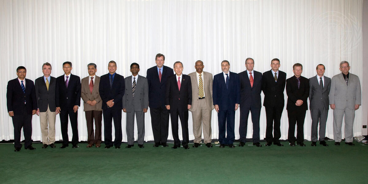 Secretary-General Ban Ki-moon (centre) poses for a group photo with participants of the Department of Peacekeeping Operations (DPKO)'s senior leadership programme. To the left of Mr. Ban is Alain Le Roy, Under-Secretary-General for Peacekeeping Operations.