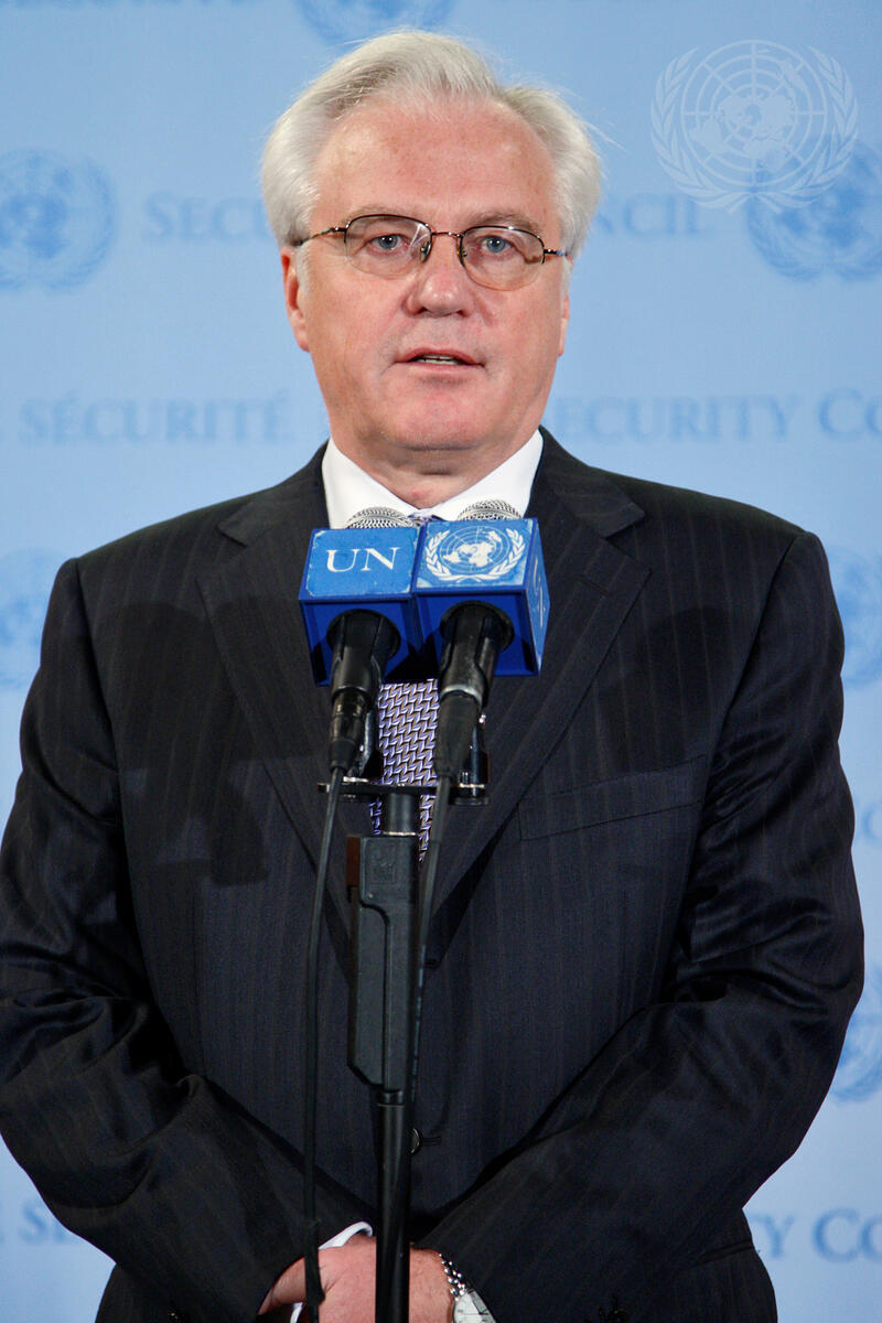 Vitaly I. Churkin, Permanent Representative of the Russian Federation to the United Nations, briefs correspondents following Security Council consultations on Iran's nuclear programme. The Council's Permanent Members, China, France, the Russian Federation, the United Kingdom and United States, agreed on a draft resolution imposing new sanctions against Iran for non-compliance with demands to suspend its nuclear enrichment activities.
