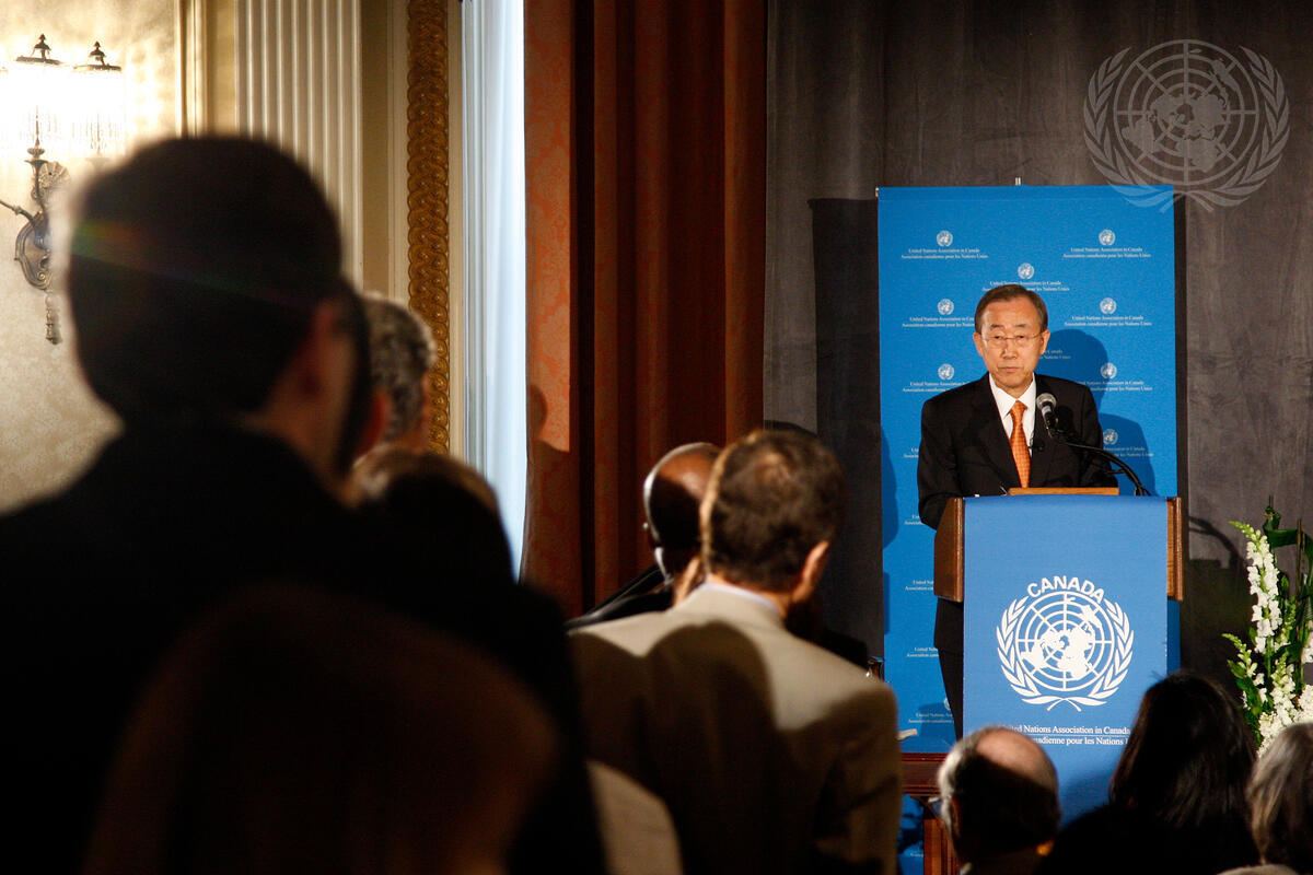 At an event hosted by the United Nations Association of Canada (UNA-Canada), Secretary-General Ban Ki-moon addresses an audience of academics, civil society and business leaders, in Ottawa, Canada.