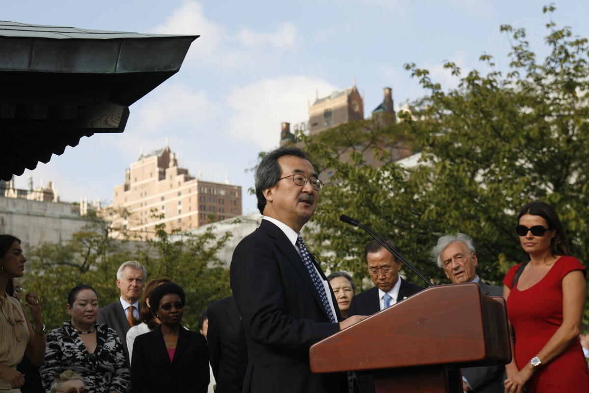 Kiyotaka Akasaka (at podium), Under-Secretary-General for Communications and Public Information, acts as master of ceremonies for the UN's annual ceremony marking the International Day of Peace. Pictured behind Mr. Akasaka is the iconic peace bell, ritually rung by the Secretary-General during Peace Day festivities.