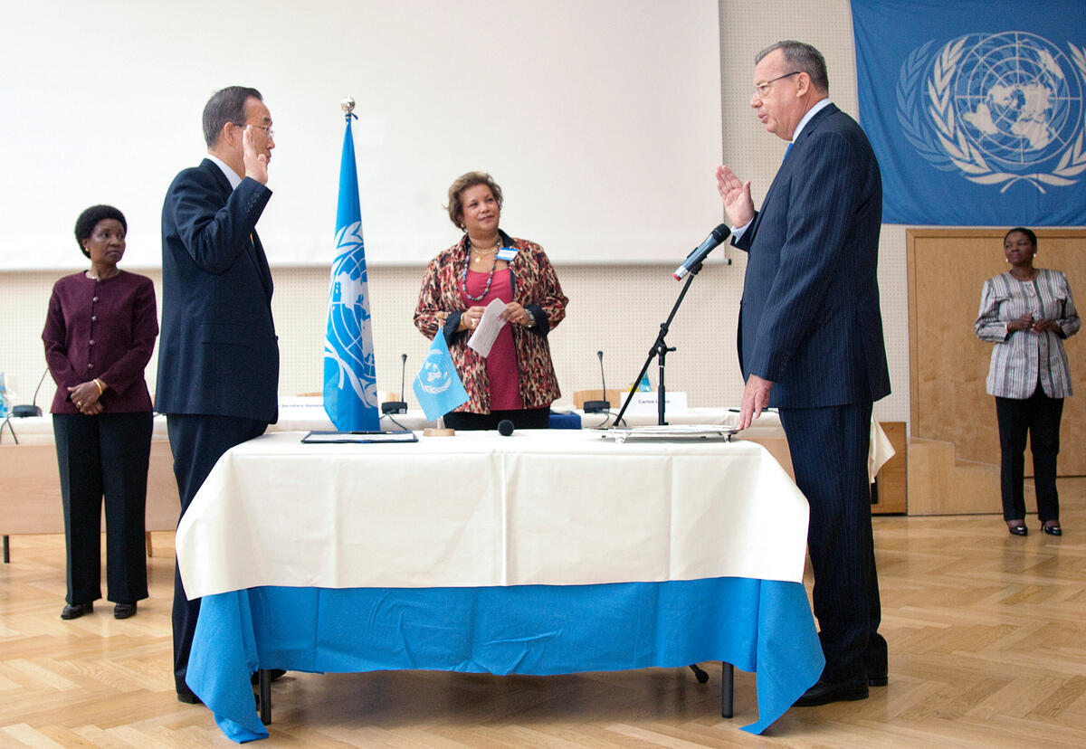 Secretary-General Ban Ki-moon (second from left) swears in Yury Fedotov as new Director-General of the UN Office in Vienna (UNOV) and Executive Director of the UN Office on Drugs and Crime (UNODC), at the UN's senior managers retreat in Alpbach, Austria.