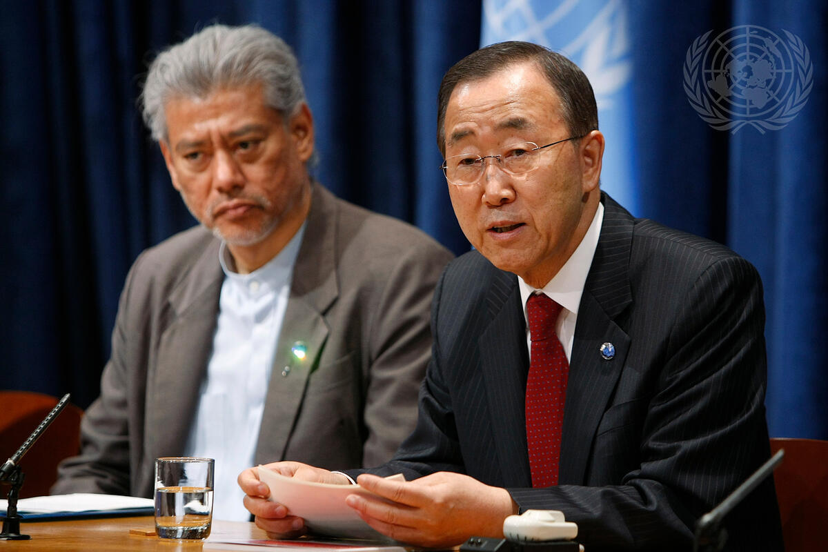 Secretary-General Ban Ki-moon addresses the press conference launching the 2010 Millennium Development Goals (MDG) Gap Task Force Report. At left is Jomo Kwame Sundaram, Assistant-Secretary-General for Economic Development.