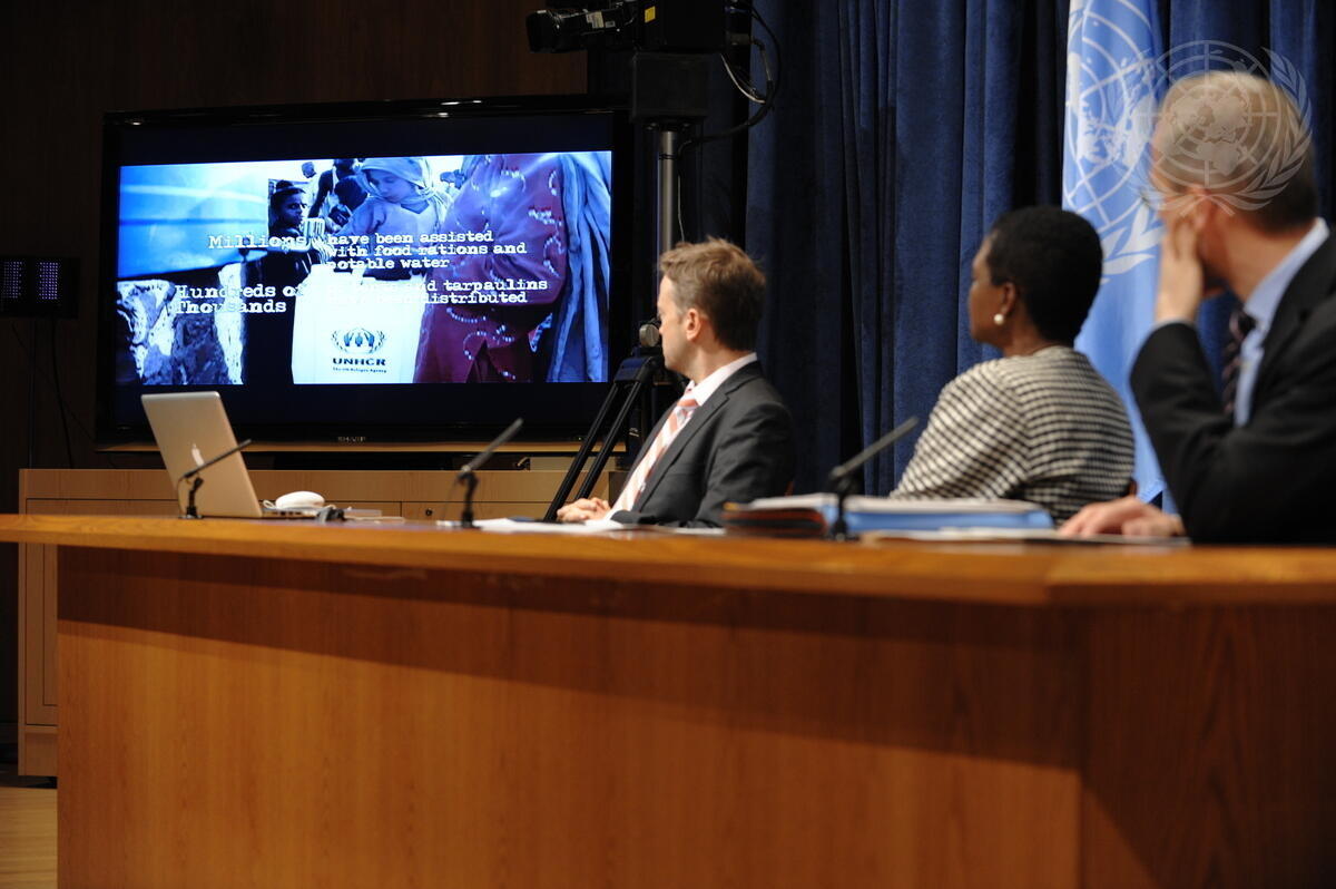 During her press conference on the situation in Pakistan, Valerie Amos (centre), Under-Secretary-General for Humanitarian Affairs and Emergency Relief Coordinator, watches a promotional spot from the UN High Commission for Refugees (UNHCR) on assistance in Pakistan. Ms. Amos' briefing comes following her recent visit to the flood-hit nation.