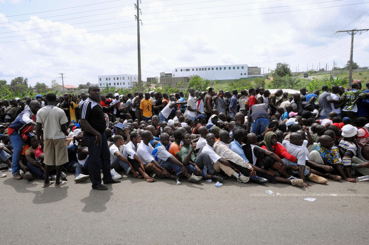 Members of the Groupement des Patriotes pour la Paix (GPP), the largest pro-government student militia group queue in line to begin the dismantling process under the auspices of the Integrated Command Centre composed of government and ex-rebel forces and supervised by the United Nations Operation in Côte d'Ivoire.