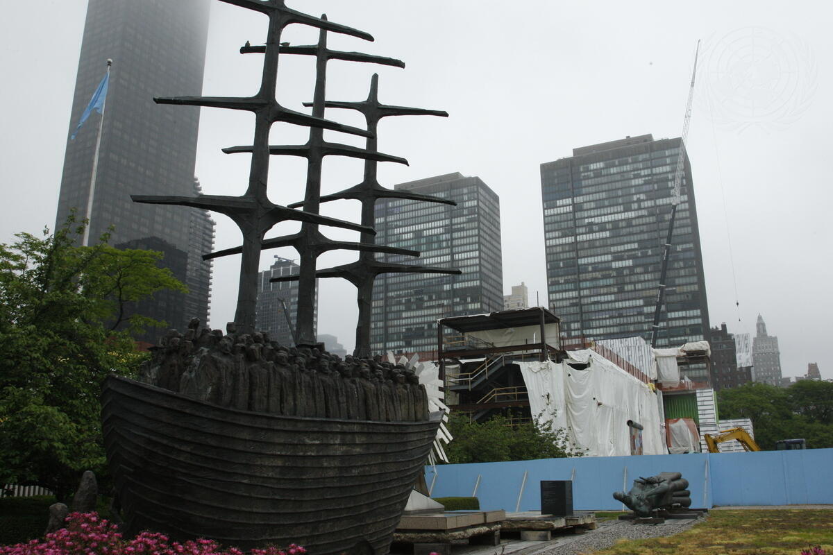 A crane lifts a section of the curtain wall for installation during the construction of the swing space to house the General Assembly, conference facilities, and the offices of the Secretary-General and his immediate staff during the renovation of the United Nations Headquarters under the Capital Master Plan.