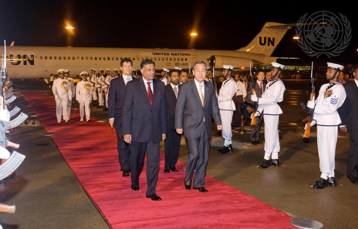 Secretary-General Ban Ki-moon (right on red carpet) and Rohitha Bogollagama (third from right on red carpet), Minister for Foreign Affairs of Sri Lanka, inspect the guard of honour.