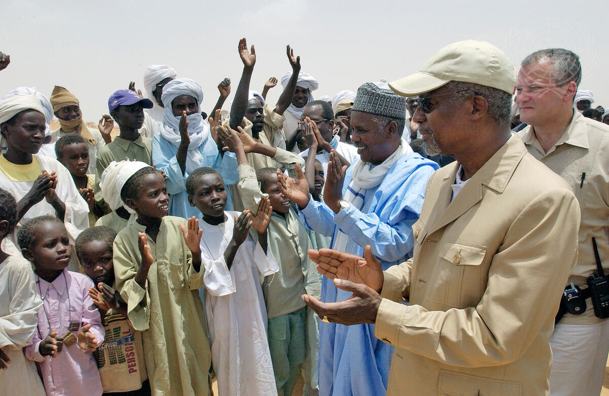 Shown, is Secretary General Kofi Annan (right foreground) with Sudanese refugees in Iridimi Camp in Chad.