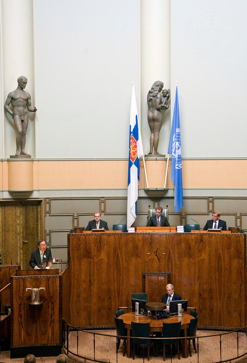 Secretary-General Ban Ki-moon (left) delivers a speech at the Parliament of Finland during his official visit to the country.