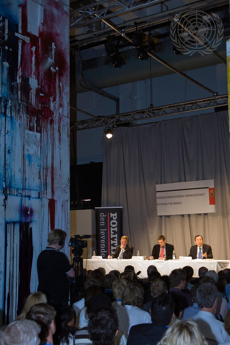 Secretary-General Ban Ki-moon (right, at podium) addresses a public dialogue meeting on ""Relaying the World - Global Crisis/Global Answers: The Role of the United Nations"", as Per Stig Møller (left), Minister for Foreign Affairs of Denmark, and Michael Jarlner, Foreign Affairs Editor of the Politiken, listen.