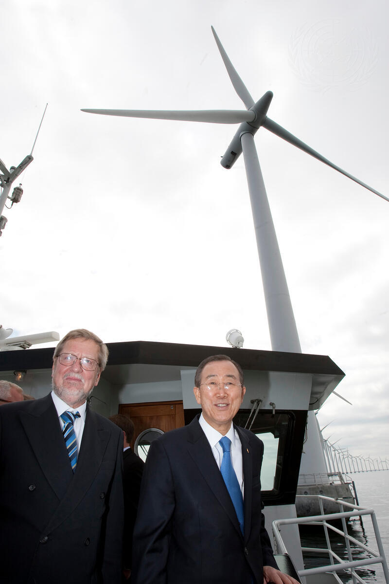 Secretary-General Ban Ki-moon (right) meets with Per Stig Møller, Minister for Foreign Affairs of Denmark, during a visit at the Middelgrunden offshore wind farm.
