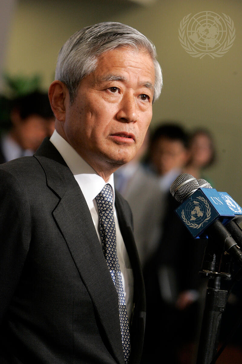 Yukio Takasu, Permanent Representative of Japan to the United Nations, briefs the media outside the Security Council Chamber after Security Council consultations on the situation in the Democratic People's Republic of Korea.