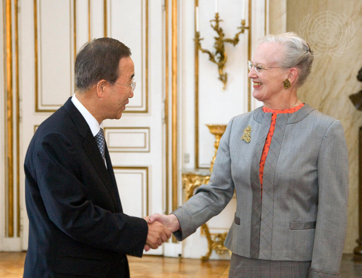 Secretary-General Ban Ki-moon (left) shakes hands with Queen Margrethe II of Denmark.