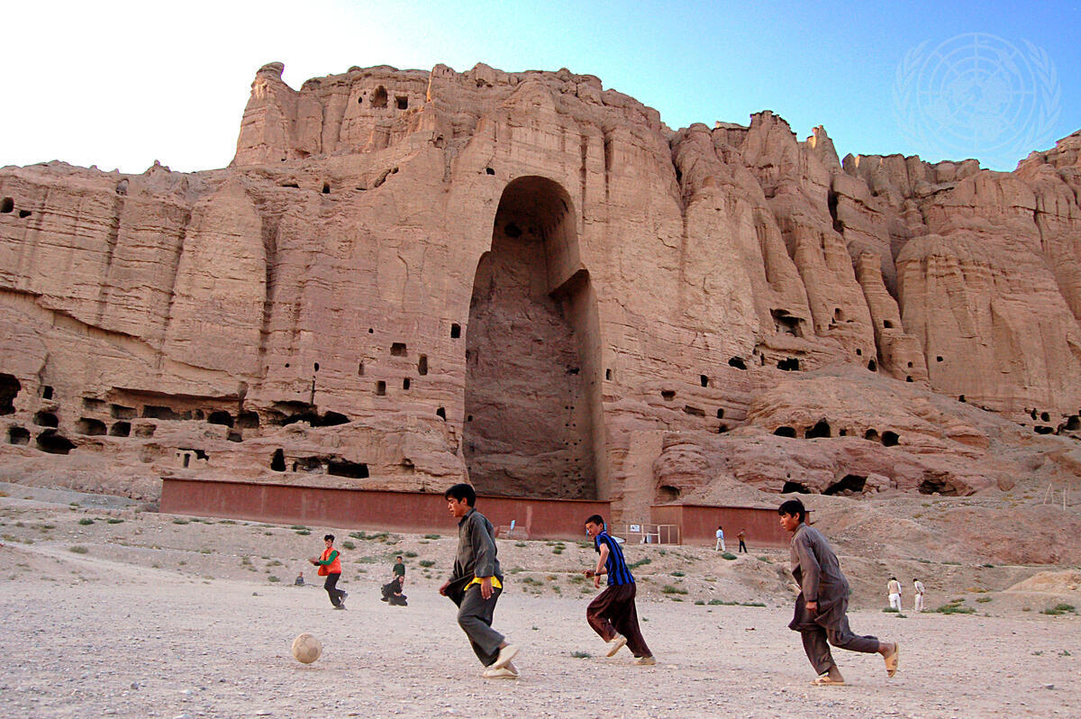 Afghan boys play football near where one of the Buddhas of Bamyan once stood. Subsequent to the 2001 destruction of the two giant standing Buddha statues by the Taliban, the UN Educational, Scientific and Cultural Organization (UNESCO) in 2003 simultaneously inscribed the cultural landscape of the Bamyan Valley onto the World Heritage List and the List of World Heritage in Danger.