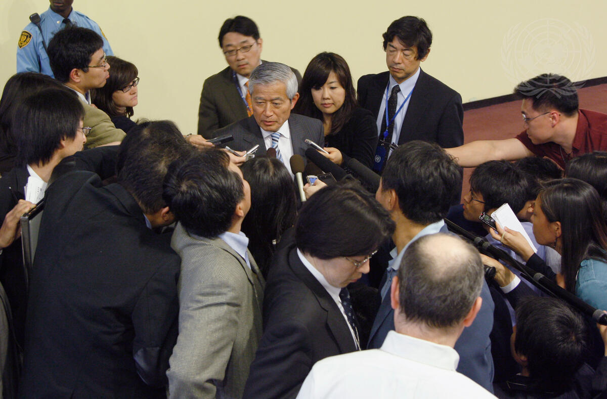 Yukio Takasu (centre), Permanent Representative of Japan to the United Nations, briefs correspondents following an informal meeting of the five permanent members of the Security Council and permanent representatives of Japan and the Republic of Korea.