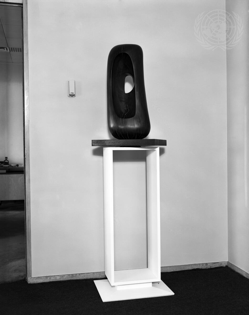 A view of a sculpture by Barbara Hepworth, well known British Sculptor, which was presented to Dag Hammarskjöld, Secretary-General of the United Nations. May 1961.