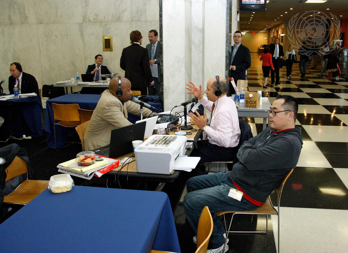Ahmad Fawzi (second from right, seated), Director of the News and Media Division (NMD) in the Department of Public Information, gets interviewed during a Talk Radio Day event.