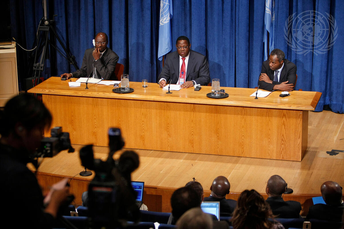 Emmanuel Issoze-Ngondet (centre), Permanent Representative of the Gabonese Republic to the United Nations and President of the Security Council for March, briefs journalists on the Council's programme of work for the month.