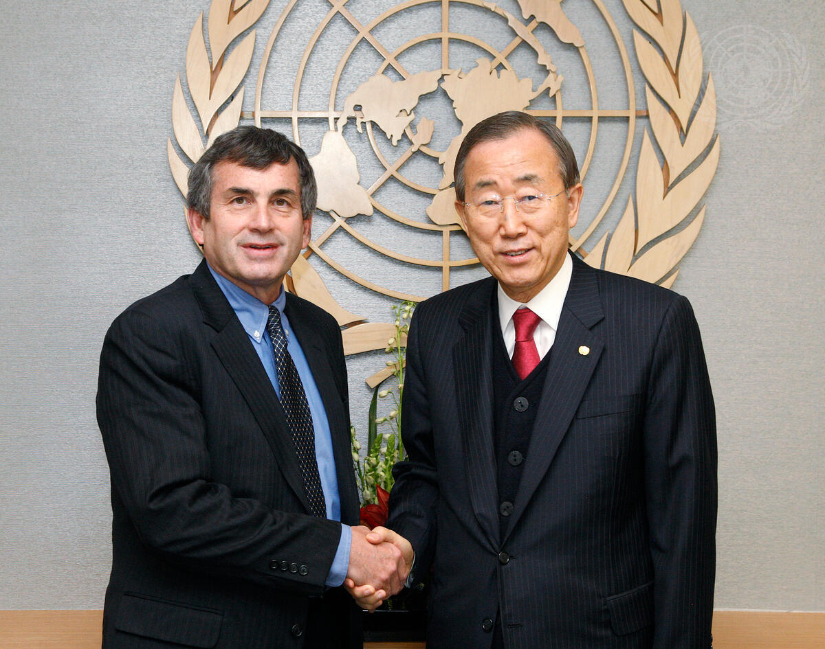 Secretary-General Ban Ki-moon (right) meets with Thomas Miller, President and CEO of the United Nations Association of the United States of America (UNA-USA).