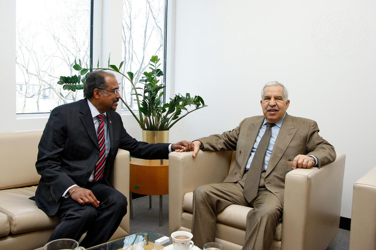Ali Abdussalam Treki (right), President of the sixty-fourth session of the General Assembly, meets with Michel Sidibé, Executive Director of the Joint United Nations Programme on HIV/AIDS (UNAIDS).