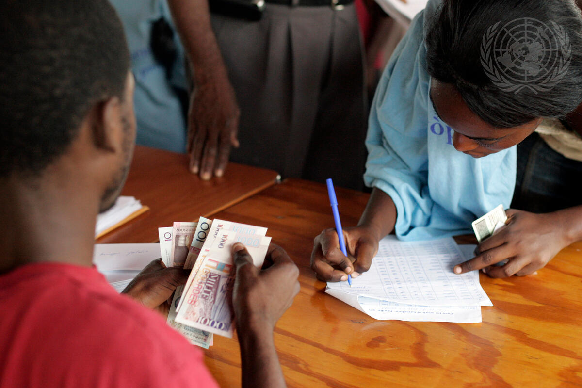 Haitians at the Sant Triyaj Fatra Kafoufey recycling factory in Port-au-Prince queue to receive payment for their street-cleaning work through the ""Cash for Work"" programme, an initiative launched by the United Nations Development Programme (UNDP) in the aftermath of Haiti's earthquake. Cash for Work participants are paid little over minimum wage and there is a 6000-person waiting list to become a street cleaner with the programme.