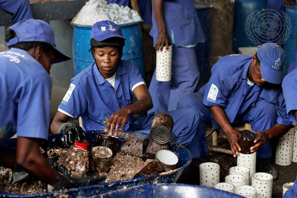 The United Nations Development Programme (UNDP)'s ""Cash for Work"" initiative partners with the Sant Triyaj Fatra Kafoufey recycling factory in Port-au-Prince to turn paper trash collected from the streets into briquettes. The paper briquettes can be used as cooking fuel rather than the wood-based ""charbon"", a charcoal whose production contributes to Haiti's deforestation problem.