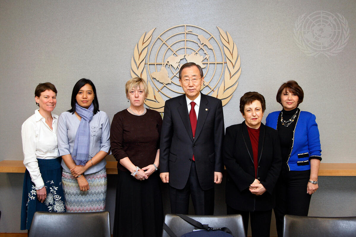 Secretary-General Ban Ki-moon (third from right) meets with Nobel Peace Laureates Jody Williams (third from left) and Shirin Ebadi (second from right), and Thin Thin Aung (second from left), Presidium Board Member of the Women's League of Burma.