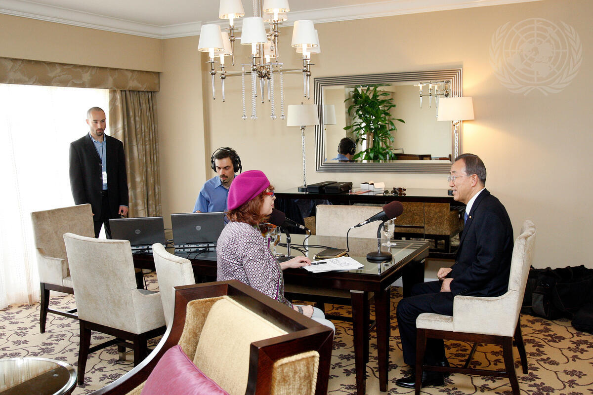 Secretary-General Ban Ki-moon (right) is interviewed by National Public Radio shortly after arriving at his hotel suite in Los Angeles, California.