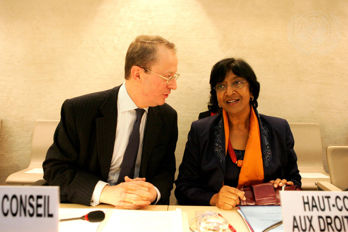 Alex Van Meeuwen (left), Permanent Representative of Belgium to the United Nations Office at Geneva and President of the Human Rights Council, chats with Navi Pillay, UN High Commissioner for Human Rights, at the high-level segment of the 13th session of the Human Rights Council in Geneva, Switzerland.