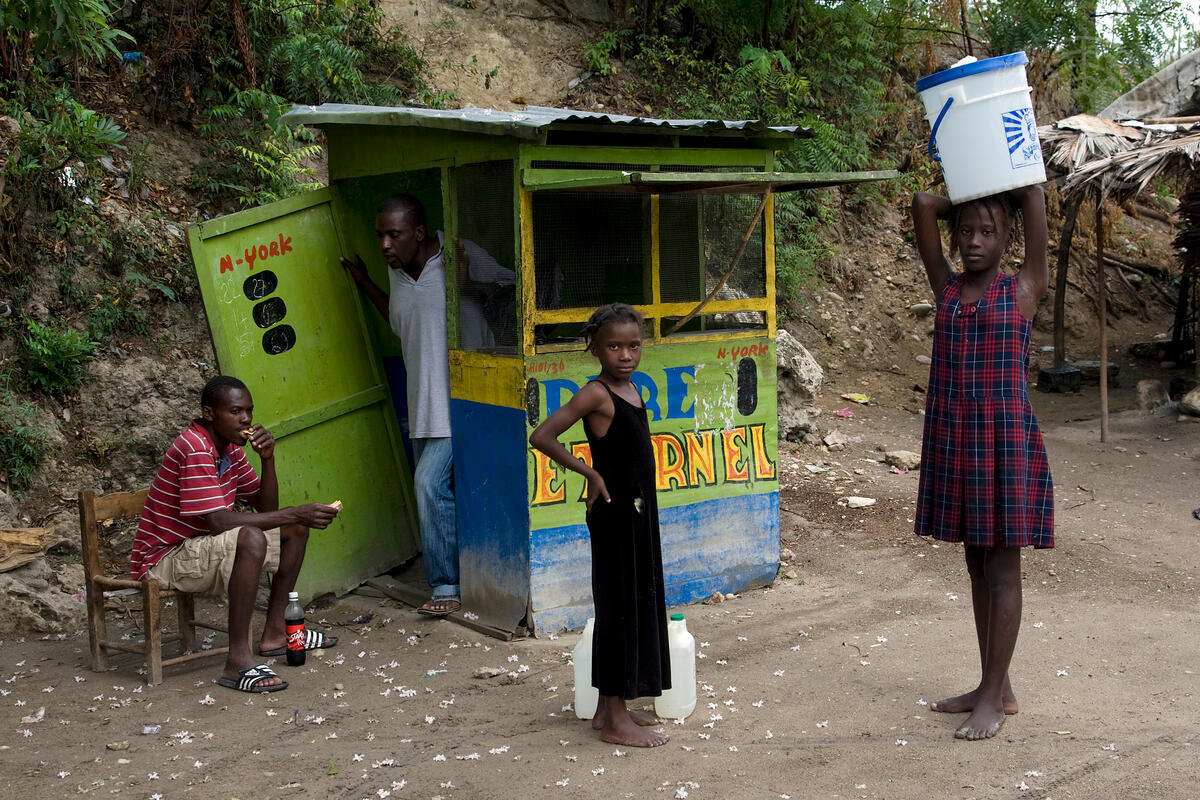 Shortages of potable water force residents of Jacmel, Haiti, to transport buckets of water from the local river to their homes.