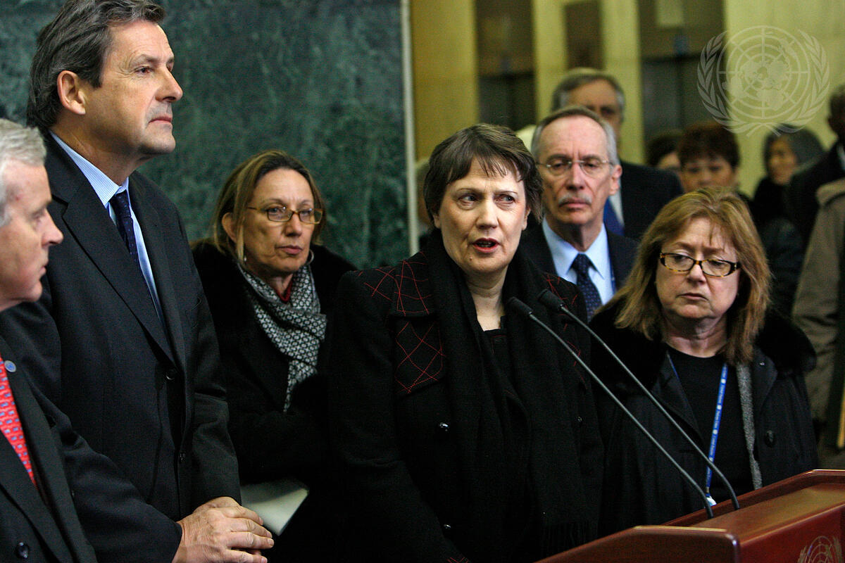 Helen Clark (centre), Administrator of the United Nations Development Programme (UNDP), speaks to journalists following the devastating earthquake that hit Haiti's capital, Port-au-Prince, on 12 January. Pictured beside Ms. Clark are Alain Le Roy (left), Under-Secretary-General for Peacekeeping Operations, and Susana Malcorra (front, right), Under-Secretary-General for Department of Field Support.