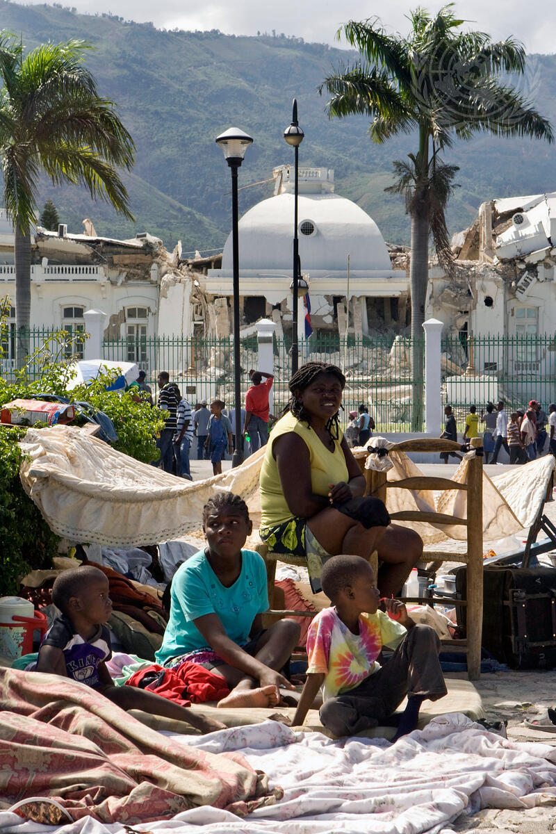 A family of earthquake survivors finds temporary shelter in an encampment facing the near-collapsed Presidential Palace in Port-au-Prince, Haiti.