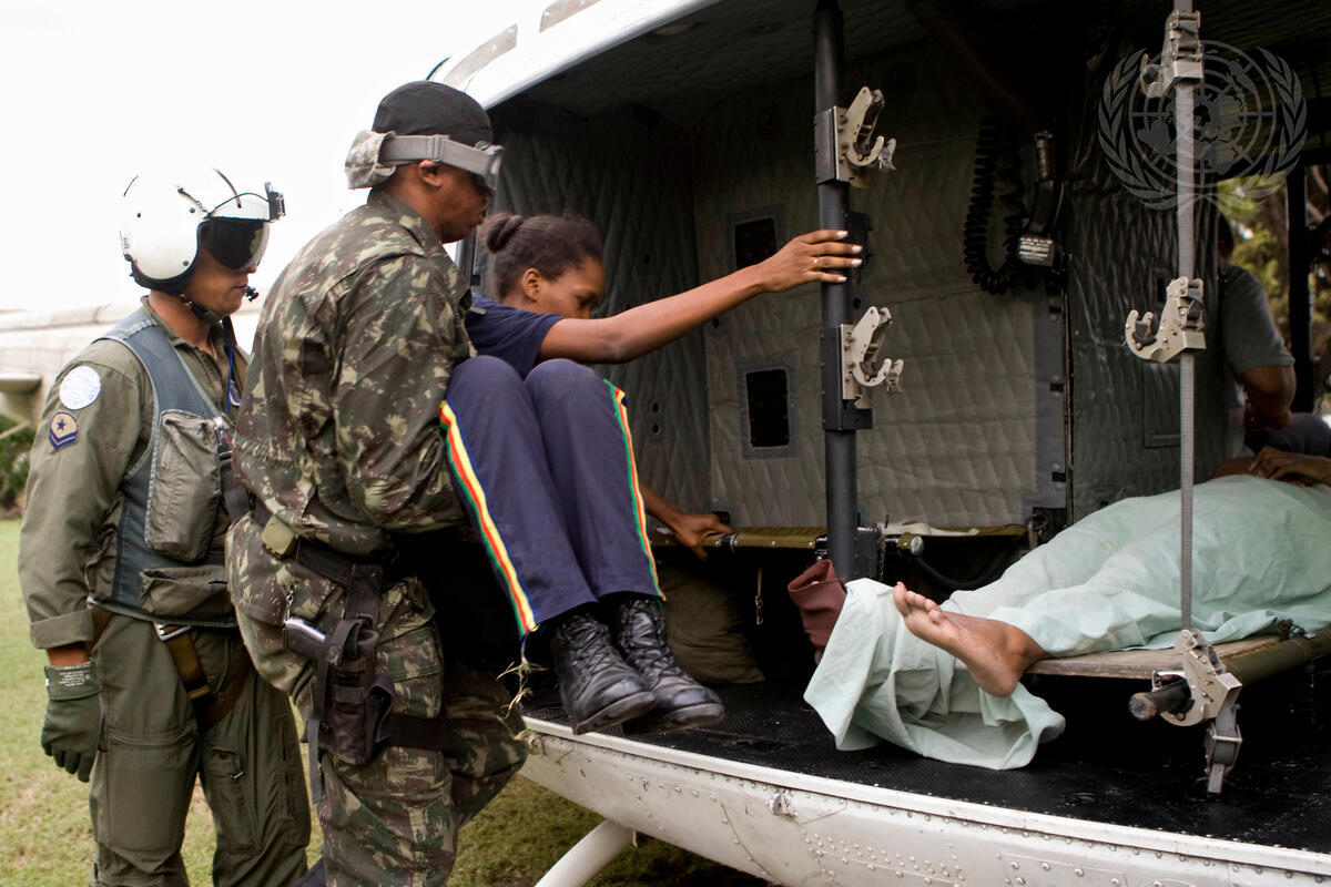 United Nations Stabilization Mission in Haiti (MINUSTAH) peacekeepers load an injured employee of Port-au-Prince's now-collapsed Hotel Montana onto a helicopter after a potent earthquake rocked the Haitian capital.