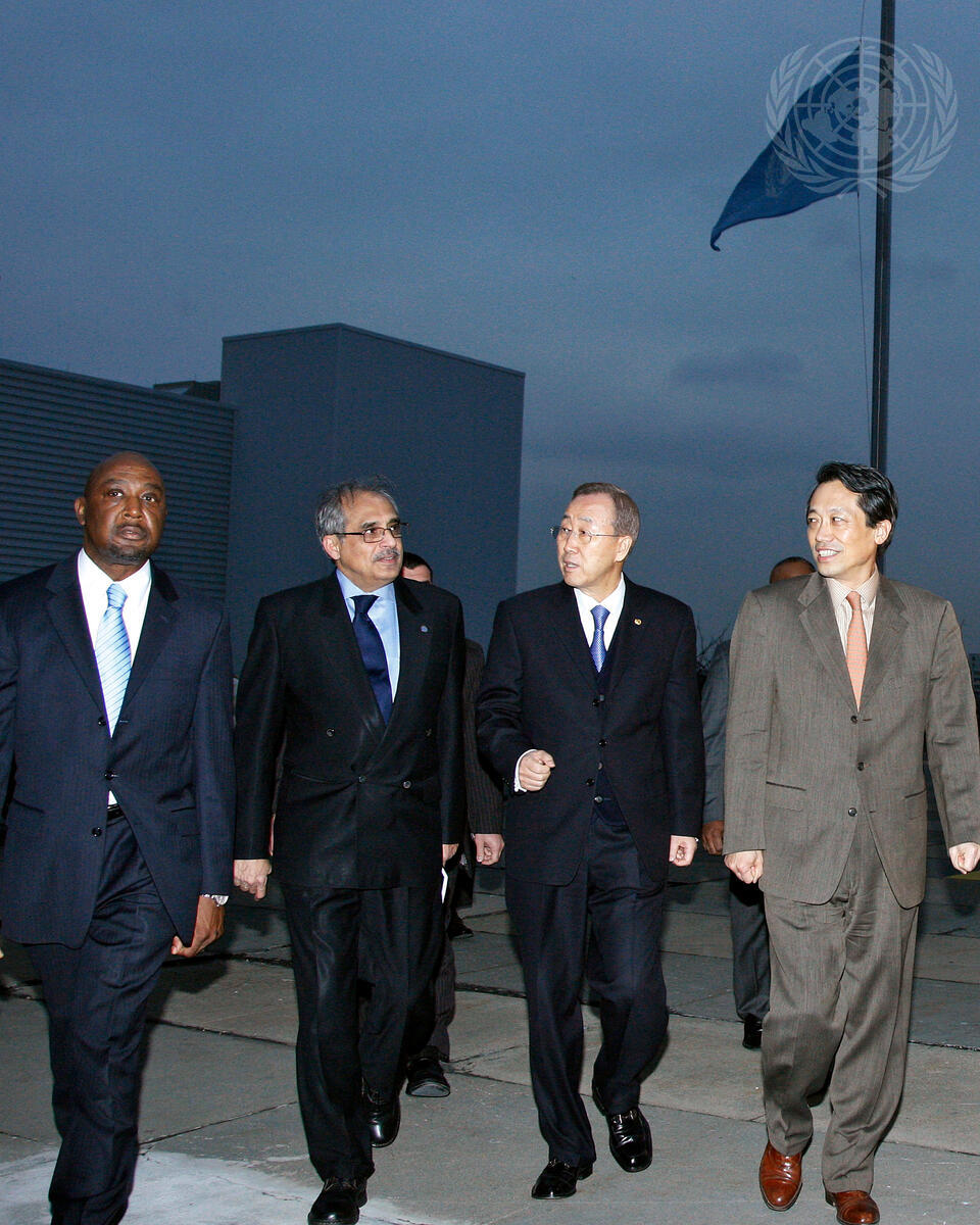 Secretary-General Ban Ki-moon (second from right) is seen on his way to a candlelight vigil held in memory of UN personnel who perished in Haiti's earthquake. With him are (from left to right), Desmond Parker, Deputy Chief of Protocol; Vijay Nambiar, Mr. Ban's Chef de Cabinet; and Kim Won-soo, Deputy Chef de Cabinet.