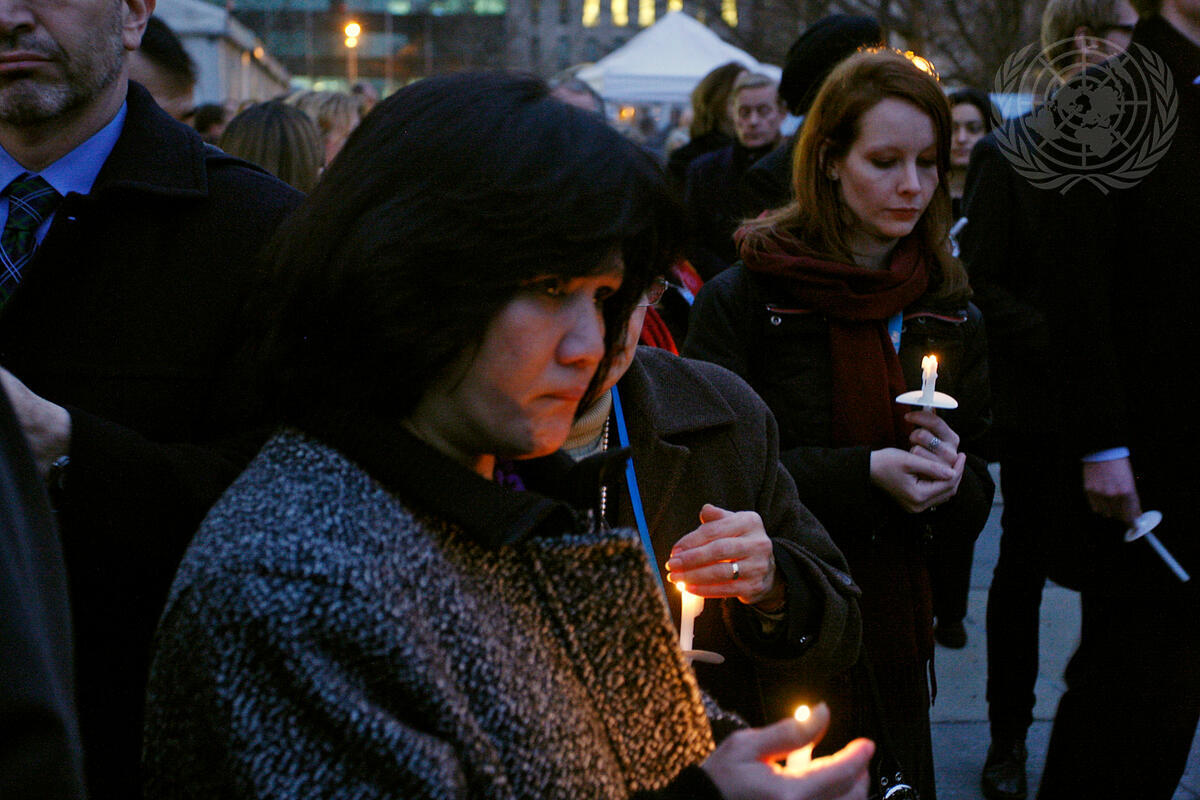 Outside UN Headquarters in New York, staff members attend a candlelight vigil in remembrance of their fallen colleagues from the United Nations Stabilization Mission in Haiti (MINUSTAH).