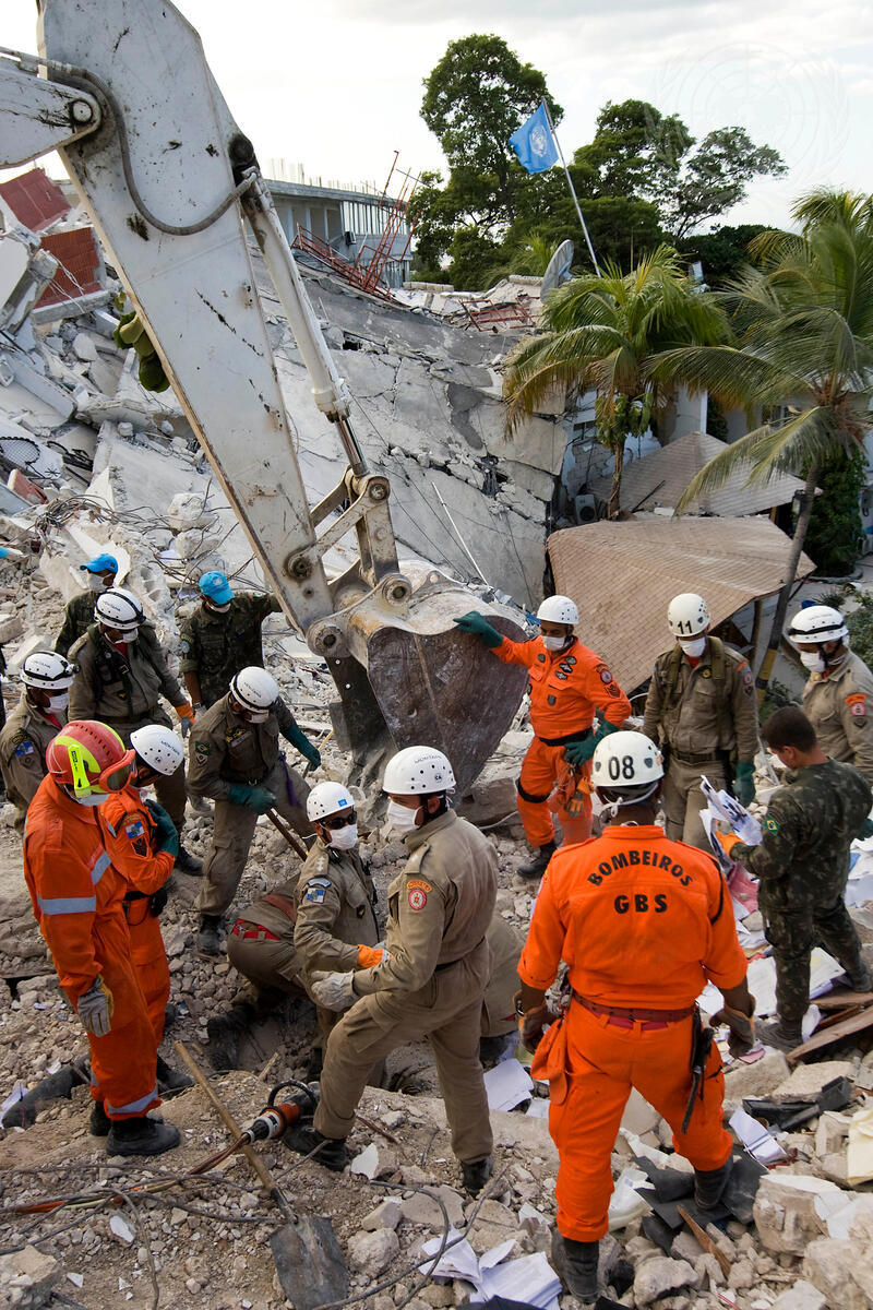 Brazilian UN peacekeepers aid a Brazilian search and rescue team to work through the rubble of the United Nations? mission headquarters in Port-au-Prince, Haiti.