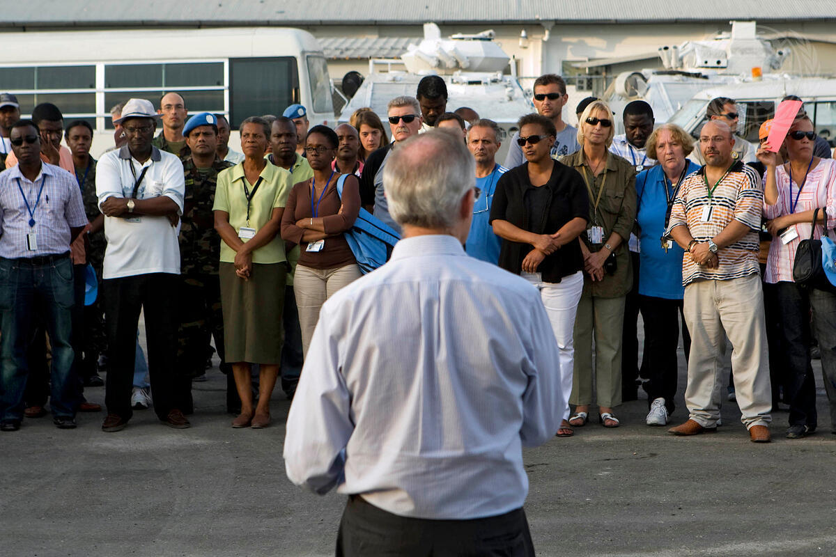 Edmond Mulet (back to camera), Acting Special Representative of the Secretary-General for Haiti and Head of the United Nations Stabilization Mission in Haiti (MINUSTAH), speaks at a memorial service in Port-au-Prince for MINUSTAH staff who perished in Haiti's earthquake.