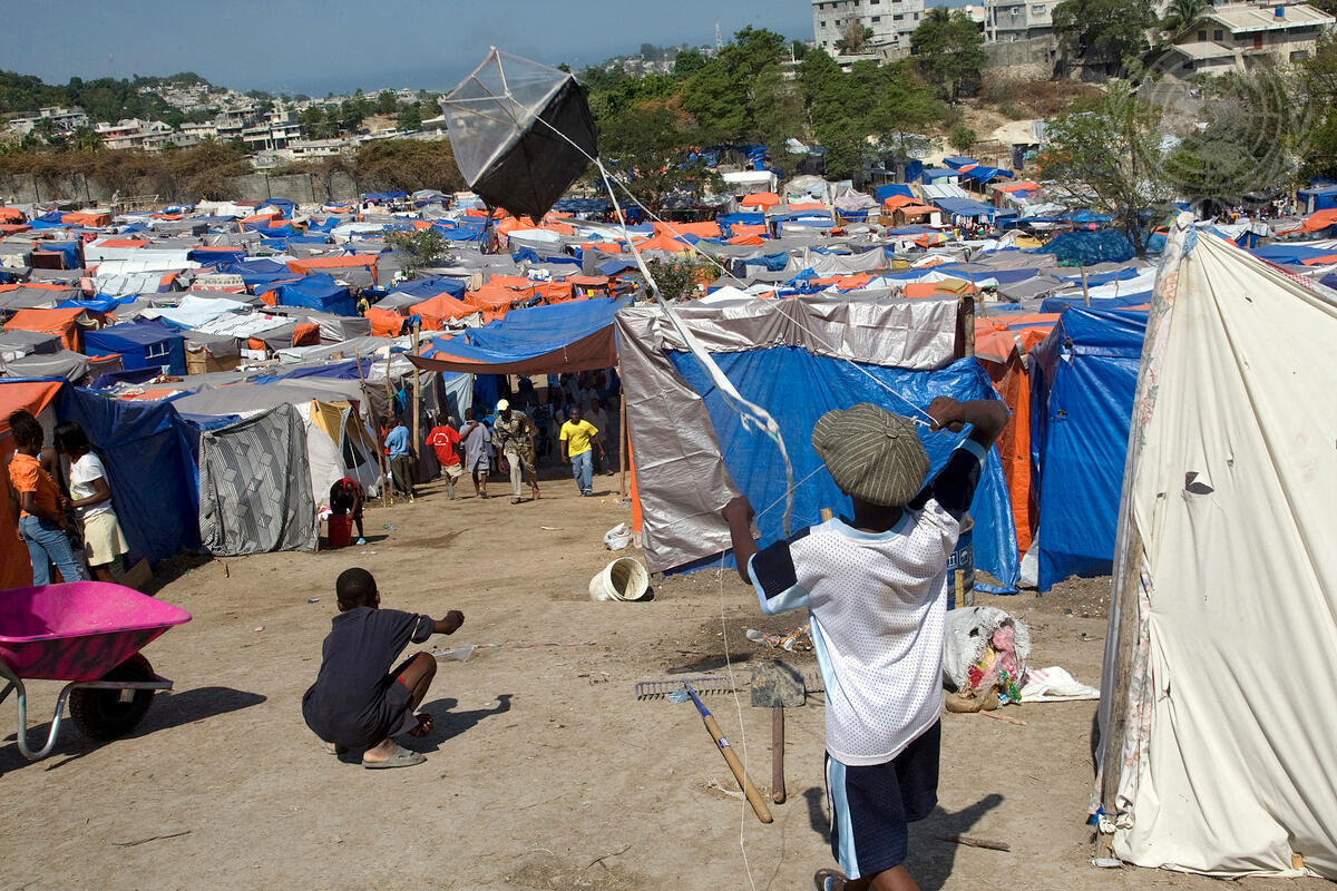 A boy flies a homemade kite at the Pétionville Club, the former Port-au-Prince golf resort now used as a campground by approximately 50,000 displaced Haitians.