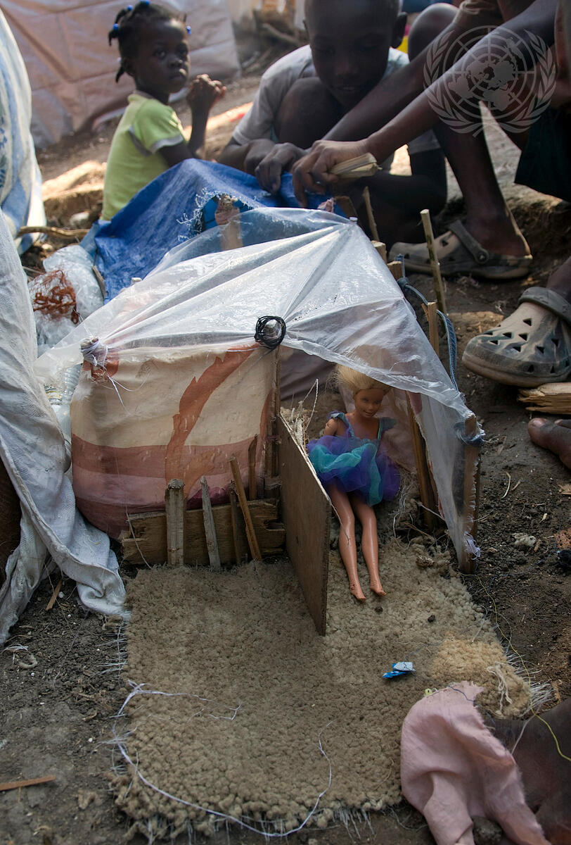 Inside the Pétionville Club, the former Port-au-Prince golf resort where some 50,000 displaced Haitians have sought shelter, children build their doll a homey tent similar to the ones found in the camp.