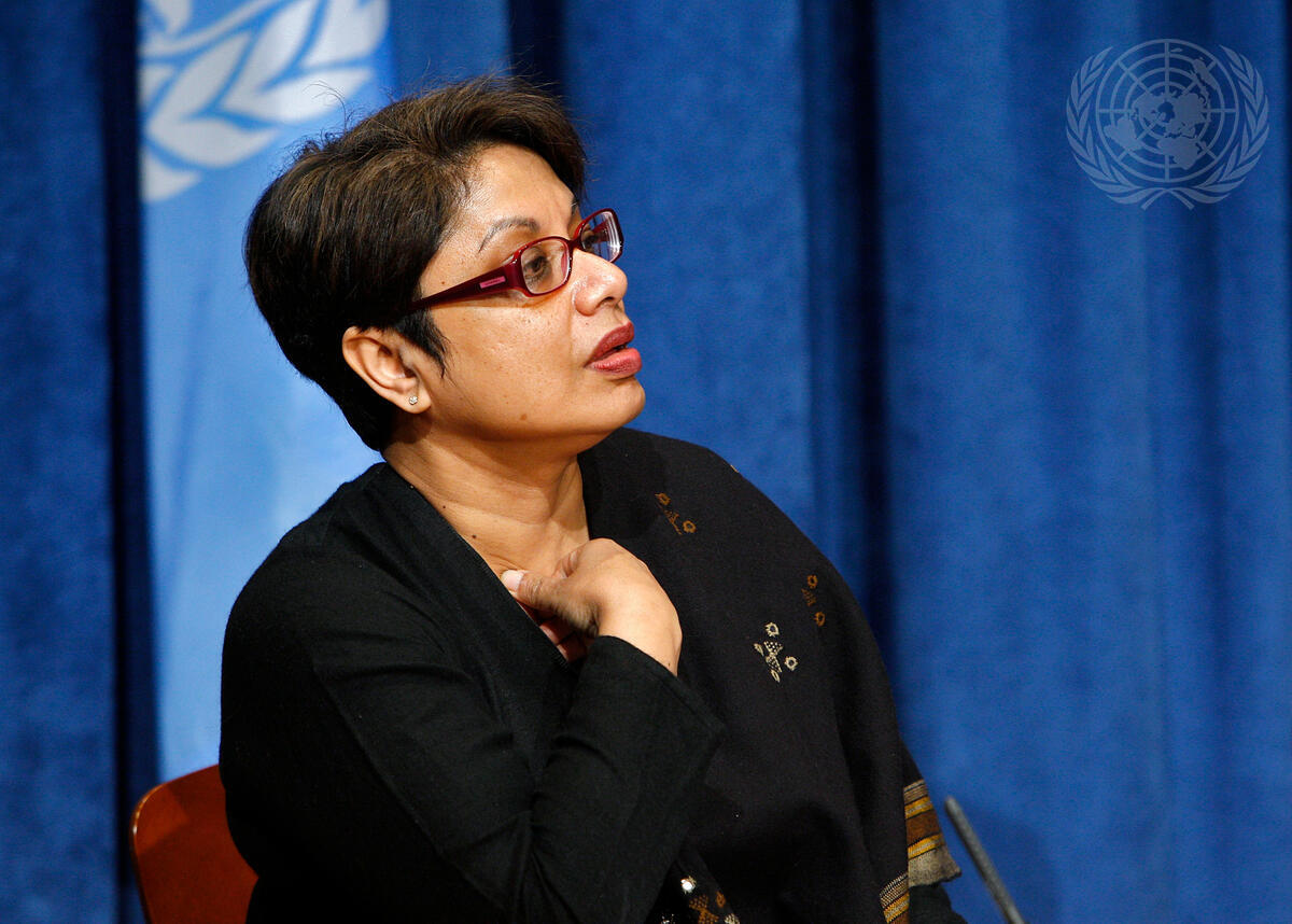 Radhika Coomaraswamy, Special Representative of the Secretary-General for Children and Armed Conflict, speaks at a press conference for the launch of the United Nations Educational, Scientific and Cultural Organization (UNESCO)'s report, ""Education Under Attack"".