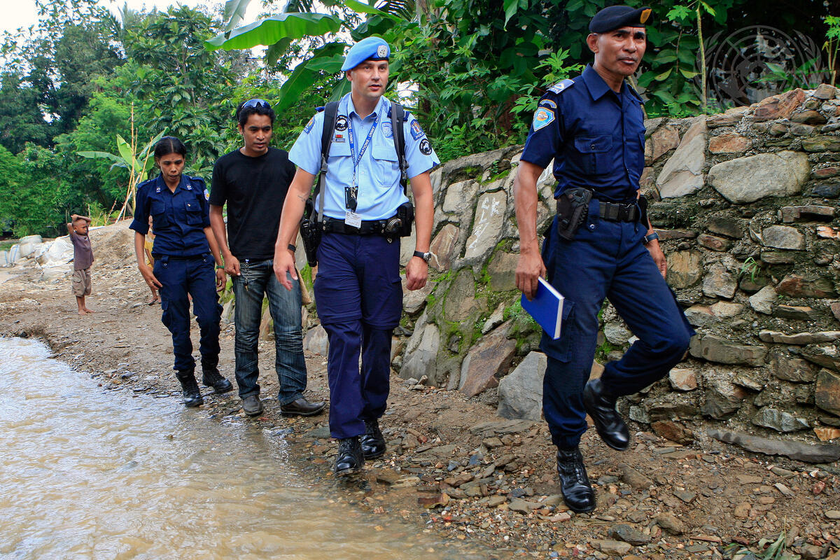 A UN Police officer with the United Nations Integrated Mission in Timor-Leste (UNMIT), together with officers from the Polícia Nacional de Timor-Leste, visits a Timorese neighbourhood damaged by heavy rains.