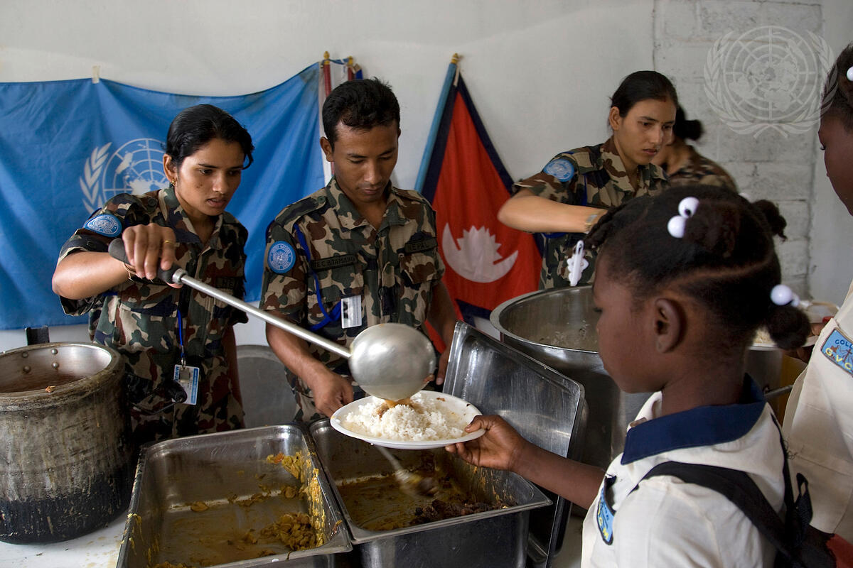 Nepalese peacekeepers with the United Nations Stabilization Mission in Haiti (MINUSTAH) carry out Civil-Military Coordination Activities (CIMIC), serving hot meals to earthquake refugees at a parish in Mirebalais, located on Haiti's Plateau Central.