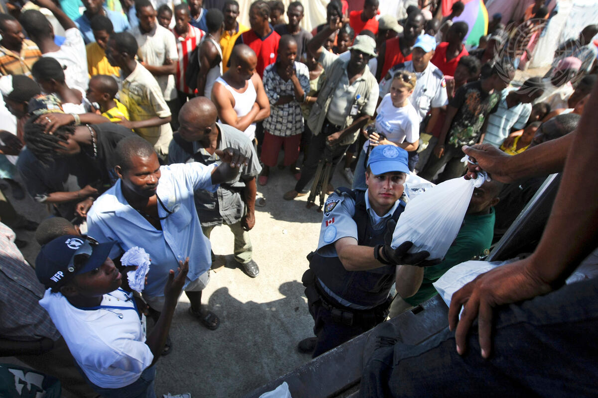 The UN World Food Programme, World Health Organization, United Nations Children's Fund, and United Nations Population Fund, coordinate the distribution of high-energy biscuits and fortified foods for pregnant women and infants outside a camp for displaced Haitians near Port-au-Prince's airport.
