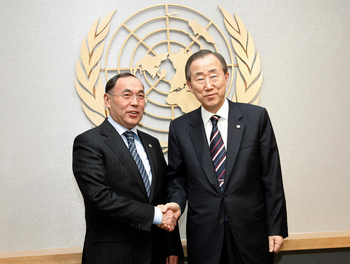 Secretary-General Ban Ki-moon (right) meets with Kanat Saudabayev, Minister for Foreign Affairs of the Republic of Kazakhstan and Chairman-in-Office of the Organization for Security and Co-operation in Europe (OSCE).