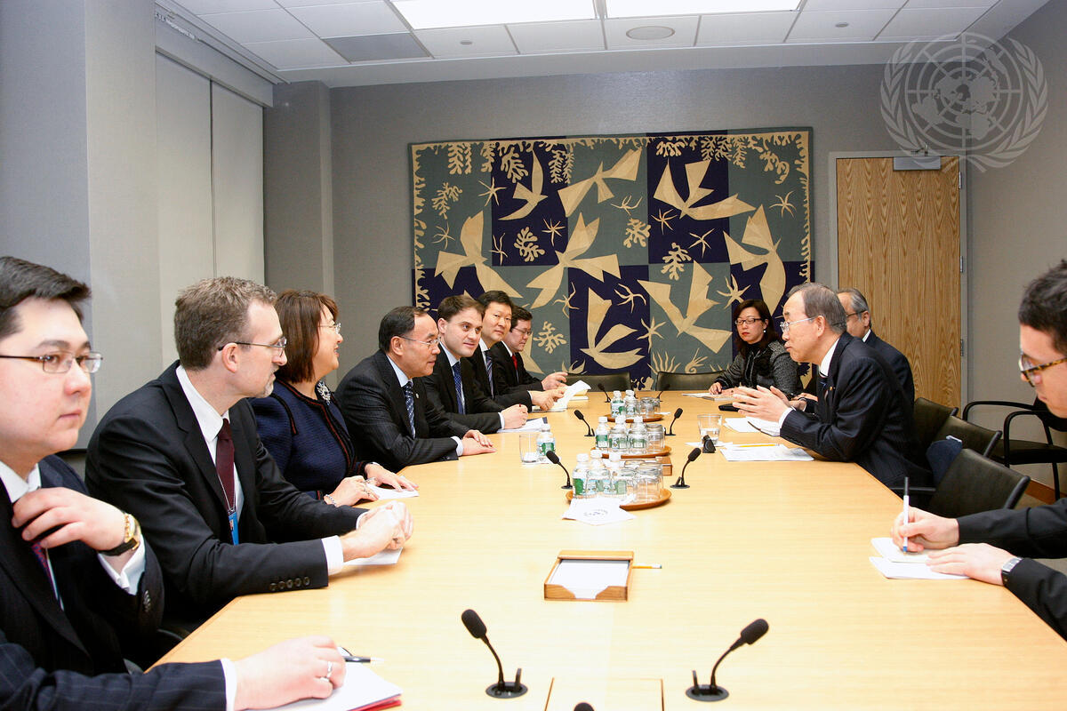Secretary-General Ban Ki-moon (second from right) meets with Kanat Saudabayev (fourth from left), Minister for Foreign Affairs of the Republic of Kazakhstan and Chairman-in-Office of the Organization for Security and Co-operation in Europe (OSCE).
