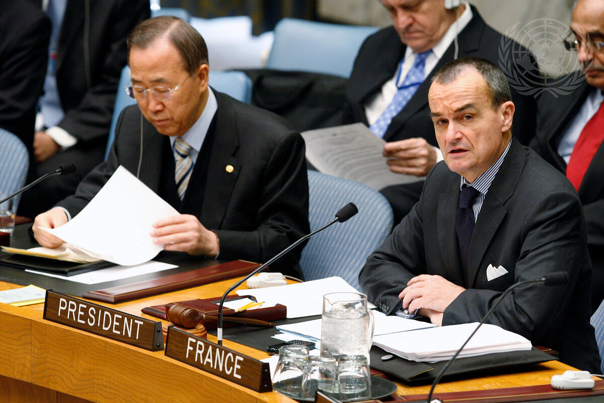 Gérard Araud (right), Permanent Representative of France to the United Nations and President of the Security Council for February, convenes the Council's meeting on transition and exit strategies in UN peacekeeping operations. At left is Secretary-General Ban Ki-moon.