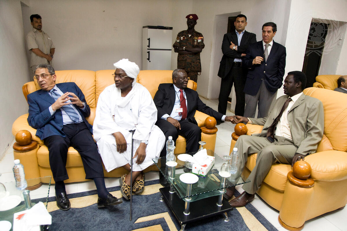 Amre Moussa (seated, left), Secretary General of the League of Arab States, meets with Othman Kibir (centre left), Governor of North Darfur; Ibrahim Gambari (centre right), Joint Special Representative for the African Union-United Nations Hybrid Operation in Darfur (UNAMID); and Minni Arko Minnawi, Senior Assistant to the President of Sudan and Chairperson of the Transitional Darfur Regional Authority (TDRA); in El Fasher, North Darfur, Sudan.