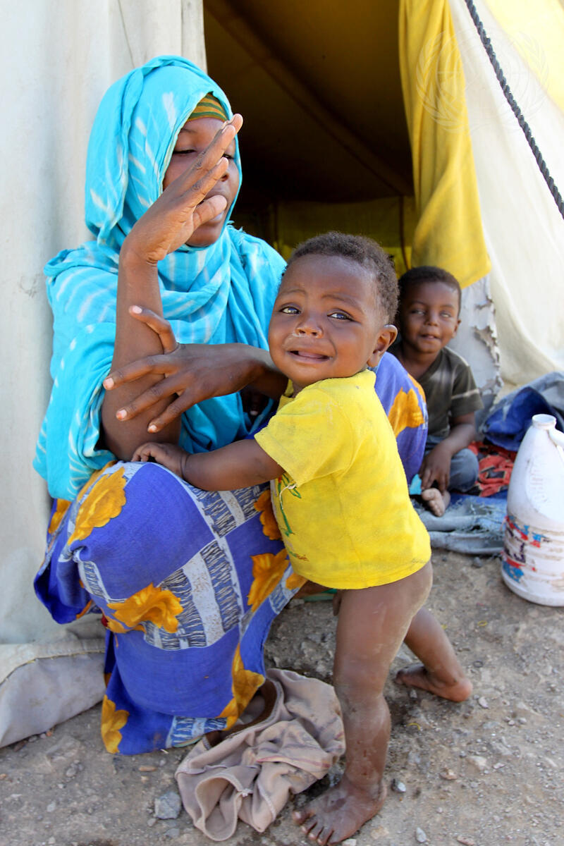 A Somali mother and her child, recently displaced by fighting in capital Somali capital Mogadishu, settle a Kharaz Refugee Camp, 140 km from Aden, Yemen.