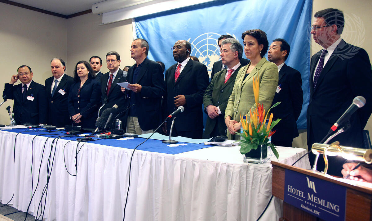 Gérard Araud (centre), Permanent Representative of France to the UN, addresses a press conference in Kinshasa, Democratic Republic of the Congo (DRC), where he led a mission of fellow Security Council Members from 13 to 15 May. Pictured to the left of Mr. Araud is Alan Doss, Special Representative of the Secretary-General and Head of the United Nations Organization Mission in the Democratic Republic of the Congo (MONUC).